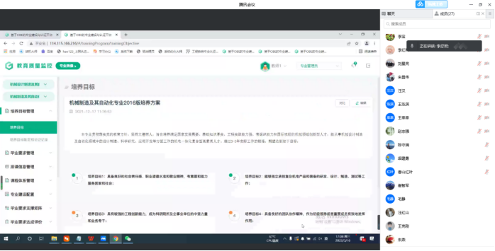 最后,西安鹏迪科技市场部负责人陈玉兰、技术工程师李忍哲对工程教育专业认证协同平台的使用及注意事项做了培训。该平台是为服务我院工程教育专业认证和其他专业认证课程达成度计算的一套专业认证信息化系统,该系统经过前期的试用完善,目前已经正式上线。培训会上,工程师就平台各角色的权限和任务一一作了演示,参加培训会的教师认真听取了讲解,并在会后就相关问题和软件工程师作了进一步的交流。