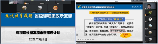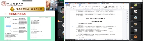 接着,全体参会老师共同观看由陕西师范大学国家级一流本科课程负责人傅钢善教授的“《现代教育技术》一流课程建设与教学实施”线上直播报告,该报告主要从信息时代的基础教育变革、“现代教育技术”一流课程建设、“现代教育技术”教学方法探索等方面进行介绍。观看过程中,各位与会老师分别进行了互动交流。