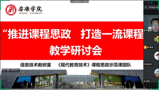 会议伊始,李宝介绍《教育部关于一流本科课程建设的实施意见》、《万象城娱乐awc线路一流课程建设实施意见》等文件内容。随后,《现代教育技术》课程思政示范课负责人宋权华对课程目前建设情况作了简要介绍,并对课程下一步建设的计划和具体工作进行安排部署。同时,结合参加陕西省思政课教师“大练兵”省级展示活动,在《现代教育技术》课程中如何挖掘思政元素、融入思政元素等与参会老师进行分享交流。