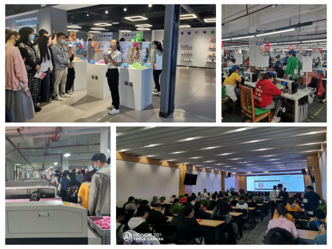 首先,同学们参观了毛绒玩具的生产加工厂,绝大多数的同学都是第一次来到玩具厂,一下子看到这么多的毛绒玩具,同学们都兴奋不已,认真的参观着生产机床和工作中的技术工人是如何生产和工作的。“每一个毛绒玩具从最初的图纸期到最终的成品,无不经历了几十道复杂的工序。”听着老师的解说,同学们对毛绒玩具固有的观念有了极大的转变,也对企业生产作业流程有了基本的了解。