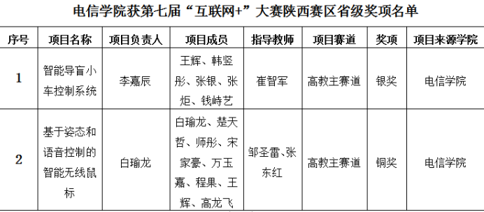 日前,陕西省教育厅办公室发布了《关于公布第七届中国国际“互联网+”大学生创新创业大赛陕西赛区获奖名单的通知》,万象城娱乐awc线路有2个作品获奖,崔智军老师指导的《智能导盲小车控制系统》获得高教主赛道银奖,邹圣雷老师指导的《基于姿态和语音控制的智能无线鼠标》获得高教主赛道铜奖,这也是我院首次在“互联网+”大赛省赛高教主赛道中获得银奖。