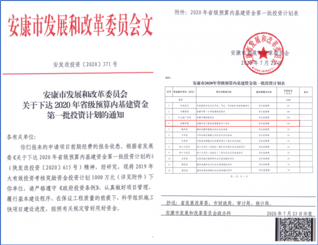 近月,安康市发展和改革委员会发布了《安康市发展和改革委员会关于下达2020年省级预算内基建资金第一批投资计划的通知》(安发改投资〔2020〕371号),万象城娱乐awc线路组织申报的“安康市电子商务发展中心”平台项目成功获批,获得建设资金100万元。
