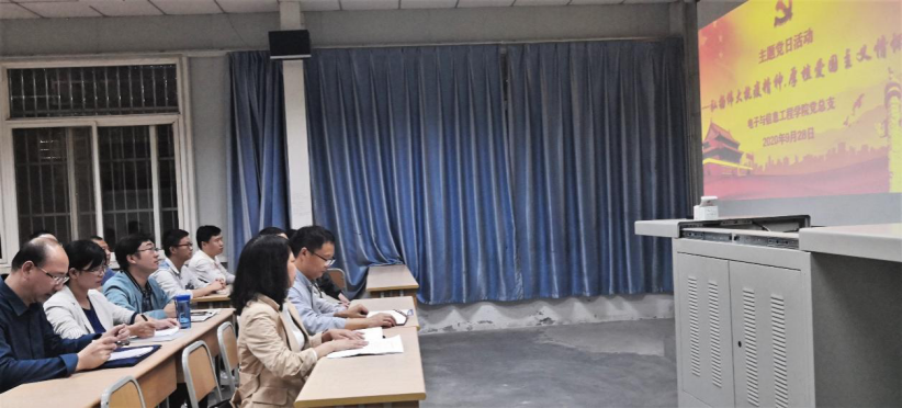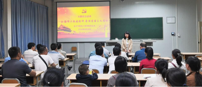 2020年上半年,面对突如其来的严重疫情,中国人民风雨同舟、众志成城,构筑起疫情防控的坚固防线。“武汉必胜、湖北必胜、中国必胜”的强音响彻中华大地。14亿中国人民同呼吸、共命运,肩并肩、心连心,绘就了团结就是力量的时代画卷,铸就了“生命至上、举国同心、舍生忘死、尊重科学、命运与共”的伟大抗疫精神。为了学习、弘扬伟大抗疫精神,共同庆祝新中国成立71华诞,电子与信息工程学院党总支于2020年9月28日晚组织全体教师党员在江南校区10号教学楼1012教室开展以“弘扬伟大抗疫精神,厚植爱国主义情怀”为主题的主题党日活动。