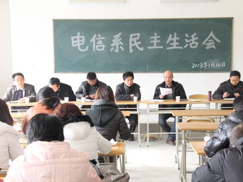 2013110下午2点,电信系根据学校《关于召开2012年度干部民主生活会的通知》,结合本系实际情况,在江北校区1317教室召开民主生活会。会议由系总支书记李红兵主持,系领导班子、全体教师参加了会议,学校副校长陈刚、副处级纪检员陈爱平莅临会议,并对本次民主生活会进行了监督和指导。