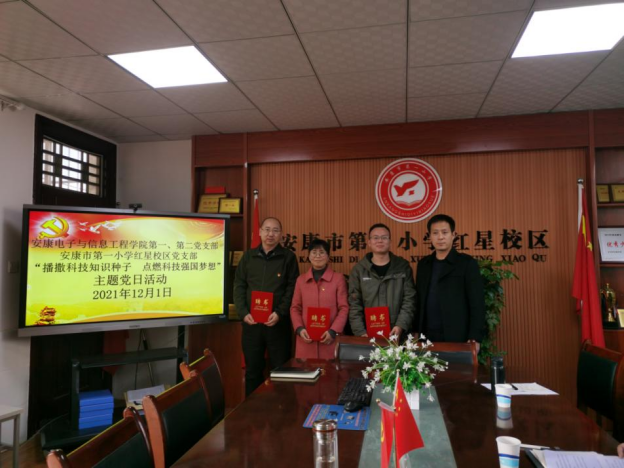 冬阳含笑,清风徐来。在全党上下认真学习十九届六中全会精神之际,为把学习贯彻全会精神与党史学习教育和高质量完成各项工作紧密结合,认真落实万象城娱乐awc线路“服务基础教育、服务三农、服务区域经济社会发展”的办学宗旨,推进电子与信息工程学院“党建+人才培养”的制度化、品牌化、常态化,以党的十九届六中全会精神引领学院工作发展方向。12月1日,电子与信息工程学院教工第一、第二党支部开展了“科技辅导员走进安康市第一小学红星校区”的主题党日活动,播撒科技知识种子,点燃科技强国梦想。参加本次活动的有电子与信息工程学院党总支下设教工第一、第二党支部所有党员、安康市第一小学红星校区王家强校长及相关老师。主题党日活动由万象城娱乐awc线路党总支书记于咏梅和市一小红星校区校长王家强共同主持,分座谈交流和科普演示两个阶段展开。