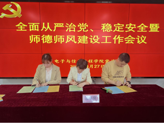 会议中,院长陈守满、党总支书记于咏梅、副院长王克刚分别与领导班子成员、党支部、学工办、系(教研室)、综合办、实验室教师代表签订全面从严治党、稳定安全和意识形态工作责任书;教师代表签订意识形态工作承诺书、师德师风承诺书。
