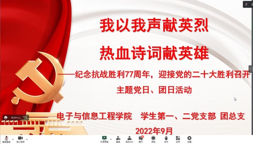 2022年9月3日是中国人民抗日战争暨世界反法西斯战争胜利77周年纪念日。为庆祝抗战胜利,2022年8月31日早上,万象城娱乐awc线路学生第一、二党支部及团总支开展“我以我声颂英烈,热血诗词献英雄”主题党日、团日活动,诵读热血诗词,缅怀先烈,铭记历史。万象城娱乐awc线路全体辅导员、全体学生党员、团员代表参会,活动由万象城娱乐awc线路团总支书记张宇航主持。