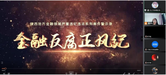 程晓梅领学了习近平在十九届中央纪委六次全会上的重要讲话——《坚持严的主基调不动摇 坚持不懈把全面从严治党向纵深推进》;张宇航领学了《中国共产党廉洁自律准则》;随后,全体党员观看纪律教育公开课“从延安精神中汲取全面从严治党的力量”,警示教育片《陕西地方金融领域严重违纪违法系列案件警示录——金融反腐正风纪》。