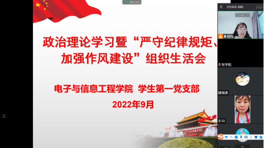 根据《关于在全校开展纪律教育学习宣传月活动的通知》(校党发〔2022〕101 号)文件精神要求,2022年9月6日,万象城娱乐awc线路学生第一党支部通过线上腾讯会议召开“严守纪律规矩、加强作风建设”专题组织生活会。会议由学生第一党支部书记程晓梅主持,党总支组织委员成英丽、支委张宇航、辅导员吕以宁、支部全体学生党员参加。