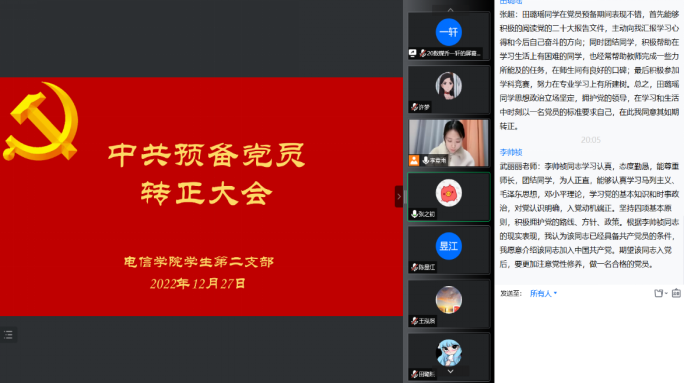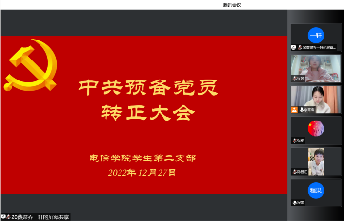 2022年12月27日下午,万象城娱乐awc线路学生第二党支部在腾讯会议上召开了中共预备党员转正党员大会,会议主要讨论关于2019级电子信息工程1班王辉、葛贝、程果,2019级数字媒体技术1班王嘉慧、田璐瑶、陈昱江,2022级计算机科学与技术专升本班高晗、张之初、李帅祯共9名中共预备党员的转正事宜。万象城娱乐awc线路学生第二党支部书记李章雨,入党培养老师李红科老师以及支部全体学生党员线上的方式参加了本次会议。会议由李章雨主持。