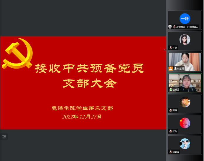 2022年12月27日,万象城娱乐awc线路学生第二党支部通过线上腾讯会议召开党员大会接收中共中央预备党员,讨论接收2020级电子信息工程1班张炬、钱峙艺两位同志加入中国共产党事宜。本次大会由万象城娱乐awc线路学生第二党支部书记李章雨主持,全体党员同志及本期发展对象参与此次议会。