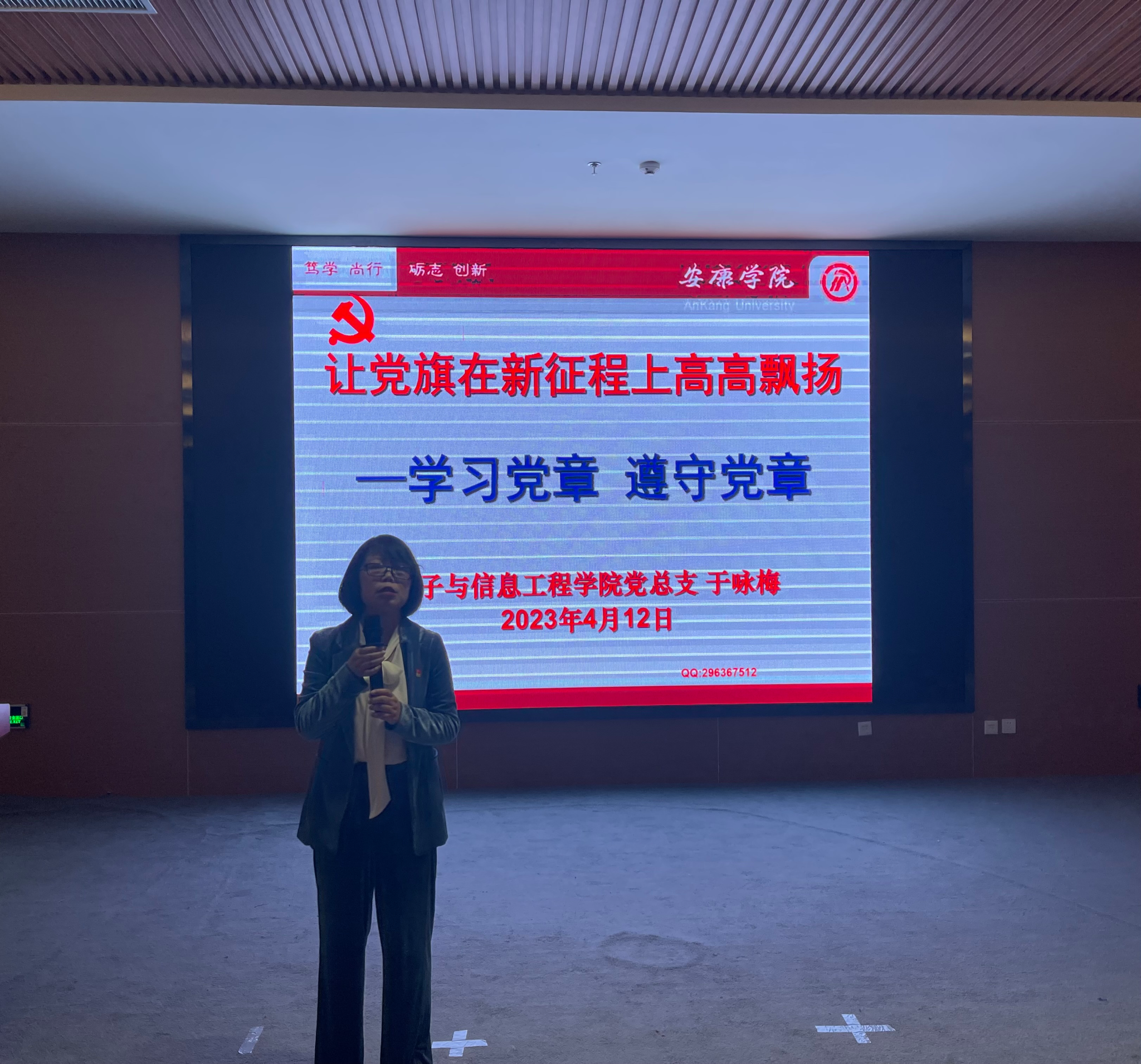 党的二十大是一次高举旗帜、凝聚力量、团结奋进的大会,取得了十分重要的政治成果、理论成果和实践成果,对全面建设社会主义现代化国家、全面推进中华民族伟大复兴具有重大现实意义和深远历史意义。学好党的二十大精神,是当前和今后一个时期的首要政治任务。4月12日下午,电子与信息工程学院党总支书记于咏梅在江北校区图书馆报告厅全院教职工、全体学生党员、入党积极分子120余上了一堂《让党旗在新征程上高高飘扬——学习党章 遵守党章》的主题党课。