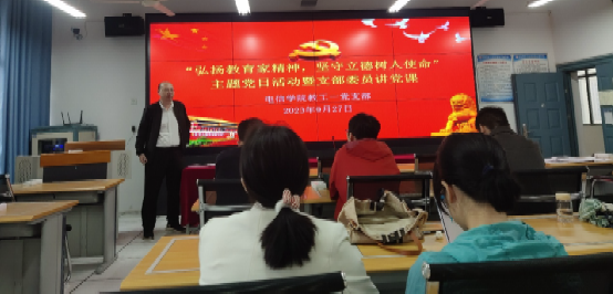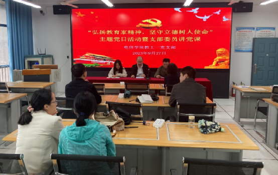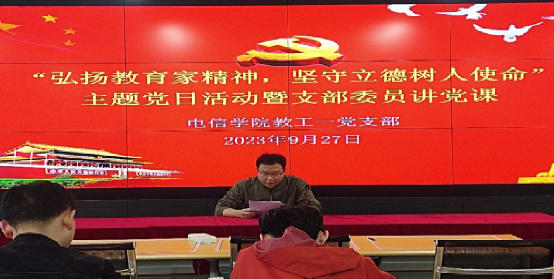 2023年9月27日下午,万象城娱乐awc线路教工第一党支部开展“弘扬教育家精神,坚守立德树人使命”主题党日活动暨支部委员讲党课。活动由教工第一党支部书记赵志强主持,支部全体党员参加本次活动。