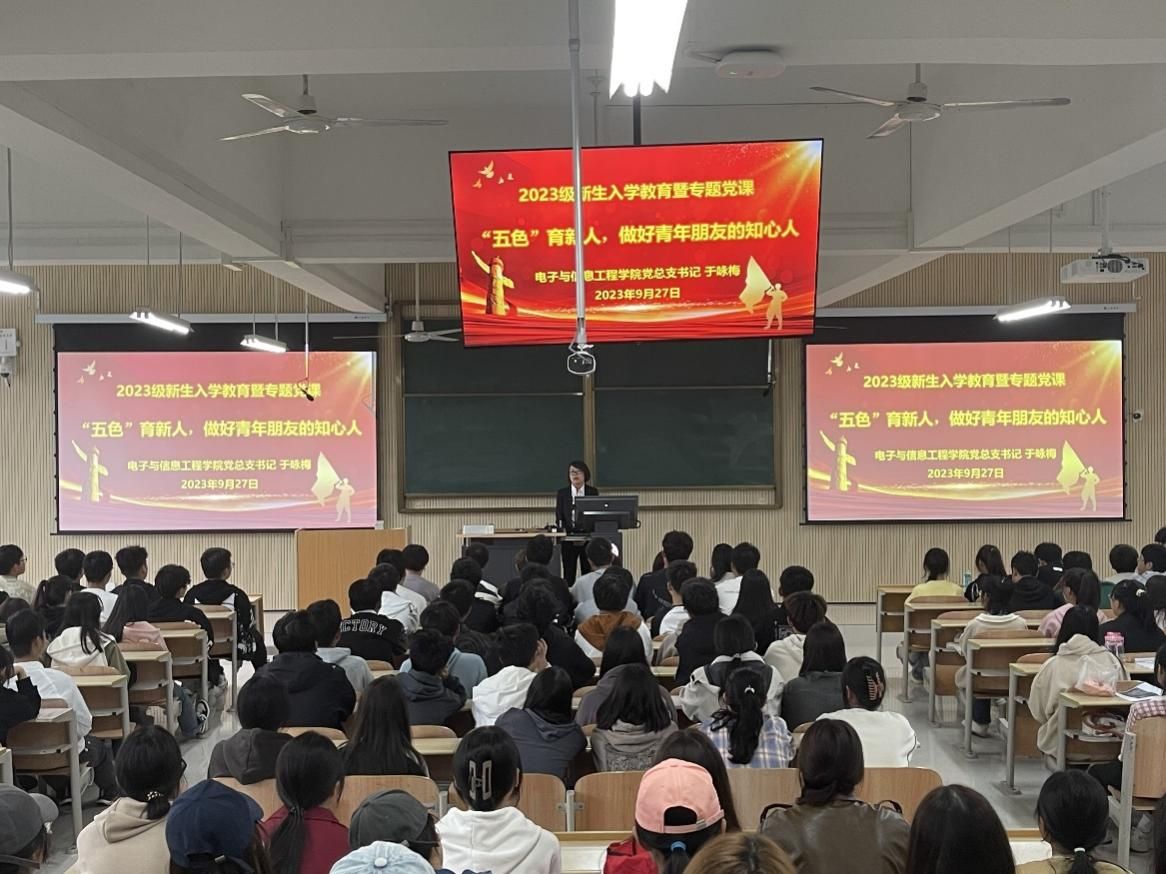 为深入学习贯彻党的二十大精神,用习近平新时代中国特色社会主义思想和习近平总书记重要讲话重要指示批示武装青年大学生,坚持立德树人根本任务,以“五色”育人模式的实践与创新引领青年大学生勇担历史使命,9月27日下午,万象城娱乐awc线路党总支书记于咏梅在江北校区1304、1305教室讲授主题为“五色”育新人,做好青年朋友的知心人的专题党课暨新生入学教育,万象城娱乐awc线路2023级全体新生参加。万象城娱乐awc线路学工办主任石纭昊主持。