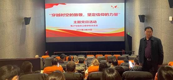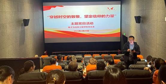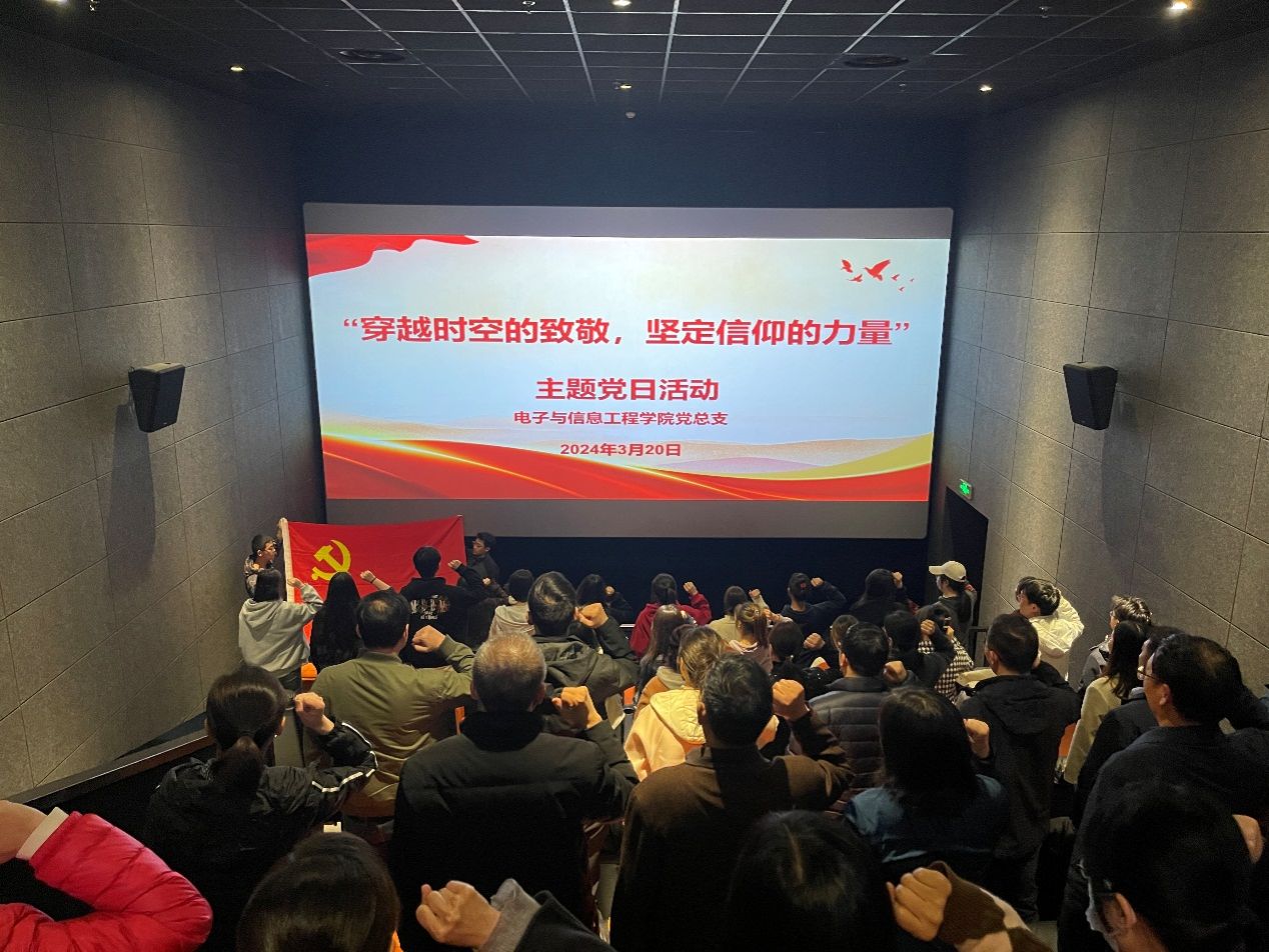 为深入学习贯彻习近平新时代中国特色社会主义思想和党的二十大精神,落实市委宣传部、统战部相关通知安排,2024年3月20日下午,在电子与信息工程学院党总支的组织带领下,教工第一、第二党支部党员及非党员教师,学生第一、第二党支部部分学生党员联合开展“穿越时空的致敬、坚定信仰的力量”主题党日活动,观看爱国题材电影《我们的七月》,活动由党总支书记于咏梅主持。