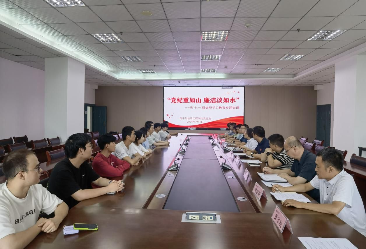 为庆祝中国共产党成立103周年,大力弘扬伟大建党精神,深入推进党纪学习教育,引领全体师生坚定不移听党话、矢志不渝跟党走,以实际行动迎接中华人民共和国成立75周年。7月1日,电子与信息工程学院党总支书记于咏梅以“党纪重如山 廉洁淡如水”为主题为党员教师及毕业生党员讲授专题党课。