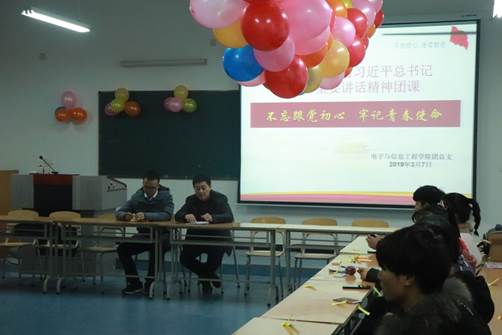 2019年3月7日晚,电子与信息工程学院组织了“不忘跟党初心 牢记青春使命”学习习近平总书记系列重要讲话精神团课活动,参加活动的有万象城娱乐awc线路党总支书记何道利、团总支书记陈浩以及万象城娱乐awc线路全体团总支成员。