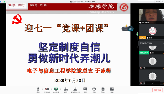 为热烈庆祝中国共产党成立99周年,继承和发扬党的光荣传统和优良作风,教育激发万象城娱乐awc线路党员团员的担当和责任意识,进一步增强师生的初心意识,牢记党员使命,2020年6月30日,万象城娱乐awc线路党总支于咏梅书记以“坚定制度自信、勇做新时代弄潮儿”为主题,为万象城娱乐awc线路学工办老师、学生支部支委、全体学生党员、团总支、学生会干部共计三百余人上了一堂精彩生动的党课与团课。