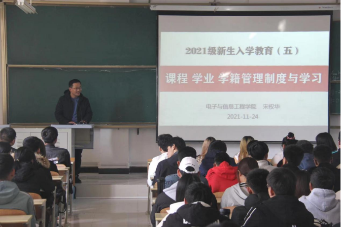 2021年11月24日下午14:30,电子与信息工程学院于1203教室开展新生入学教育第五讲,本次讲座以“课程 学业 学籍管理制度与学习”为主题。2021级全体新生参加讲座,本次讲座由电子与信息工程学院副院长宋权华老师主讲。
