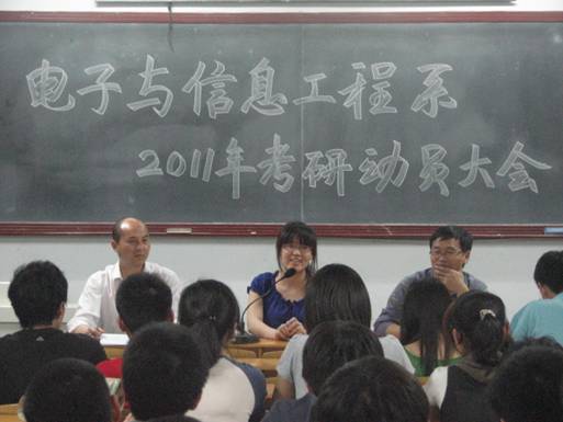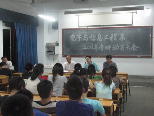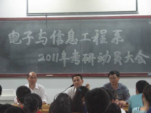 大会首先由考研成功的07级学生介绍考研经验和感受,这几位同学分别考入了西北工业大学,西安邮电学院等知名大学。他们从考研的准备、考研目的与心态、考研复习进度等方面,与大家分享了自己的经验和心得。接着,系副主任陈守满教授进行了动员讲话,陈守满教授讲了考研的必要性,对08级考研的同学提出了四点要求,他强调考研是一个艰辛、漫长的过程,考研的同学一定要做好充分的身体和心理准备,努力拼搏,争取取得好的成绩。教研室主任王庆春、付争方分别从电子信息工程和计算机科学与技术两个专业的课程特点出发对同学们如何进行报考和复习进行了指导。