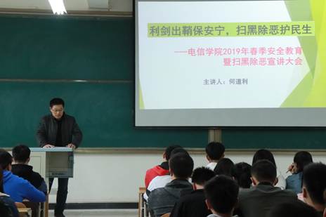 2019年3月22日下午4点,电子与信息工程学院团总支于1305教室开展了2019年春季安全教育暨扫黑除恶宣讲活动。参加此次活动的有万象城娱乐awc线路党总支书记何道利、团总支书记陈浩以及万象城娱乐awc线路全体学生干部。