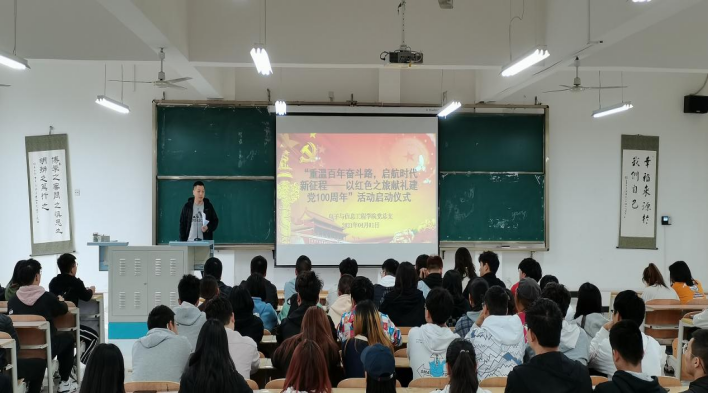 2021年4月1日下午16:00,电子与信息工程学院在教学楼1201教室举办了“重温百年奋斗路,启航时代新征程——以红色之旅献礼建党100周年”活动启动仪式。本次活动出席的人员有:学生工作办公室主任石纭昊老师,第一党支部书记成英丽老师,第二党支部书记、团总支书记李章雨老师以及全体学生党员,第50、51期入党积极分子等学生主要干部。