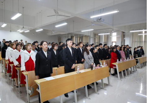 会议第二阶段,新一届团总支、学生会成立大会正式开始,所有参会人员全体起立唱国歌,气势磅礴的国歌声响彻整个会场。