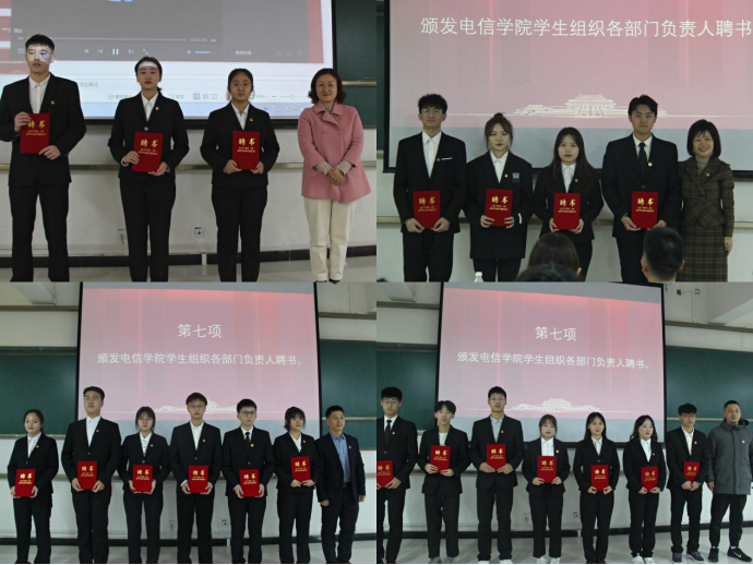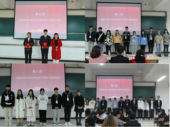 随后,参会领导和老师分别为万象城娱乐awc线路新一届团学组织各部门负责人颁发聘书,及向各部门干事进行授牌。