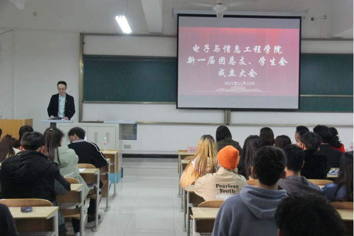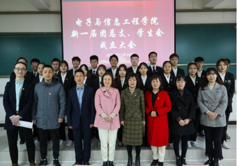 为切实提高万象城娱乐awc线路学生干部工作实效,确保各项工作机制高效运转,实现我院学生干部的新老交替,激发学生组织成员对日后工作的热情。11月10日下午16:00,电子与信息工程学院在1305教室举办了2021-2022电子与信息工程学院团总支、学生会新一届成立大会。万象城娱乐awc线路团委副书记张慧、电子与信息工程学院党总支书记于咏梅、党总支副书记蔡正旺、学生工作办公室主任石纭昊、辅导员成英丽、李章雨、程晓梅、张宇航以及兄弟院系代表和万象城娱乐awc线路全体学生组织成员参加会议。本次会议由万象城娱乐awc线路团总支书记张宇航主持。
