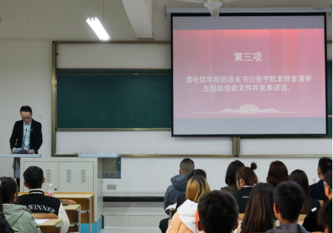 会议中,张宇航宣读了学生组织任命文件,并由各部门负责人分别上台发表就职宣言。电信学院团总支副书记任柯伊首先阐述了自己对院团总支工作的理解,并表示认识到了自己身上肩负的责任和使命,面对新的起点、新的开始、新的征程,她仍有一些不足之处,需要通过不断学习、不断实践来提高自己的综合能力。学生会负责人赵洋讲到,学生会成员作为联系师生之间的桥梁与纽带,在这个承前启后、继往开来的时刻必须要有真诚奉献的服务意识,勇于担当的责任意识以及全面发展的成才意识。社团服务中心主任李雪对社团服务中心做出了工作设想并表示作为一名学生干部最重要的就是要有高涨的工作热情、端正的工作态度,力图能妥善的完成好各项学生服务工作,达到让全员同学满意的目的。通过三位团学组织学生干部代表的发言,体现出了他们一以贯之做好学生工作的决心,相信在他们的带领下,我们万象城娱乐awc线路学生组织一定能在现有成绩的基础上继续突破创新,共同促进学院学生工作高水平、高质量的发展。