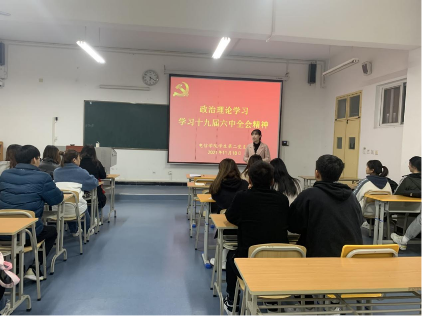 2021年11月18日下午,电子与信息工程学院学生第二党支部在江北校区1321教室开展主题党日活动,就《习近平总书记在庆祝中国共产党成立一百周年大会上的讲话》和《中国共产党第十九届中央委员会第六次全体会议公报》进行专题学习,学生第二党支部支委、全体在校党员及发展对象参加了此次会议,会议由学生第二党支部书记李章雨主持。