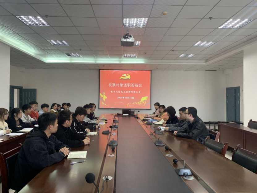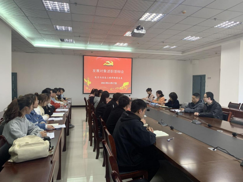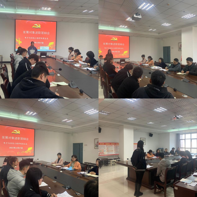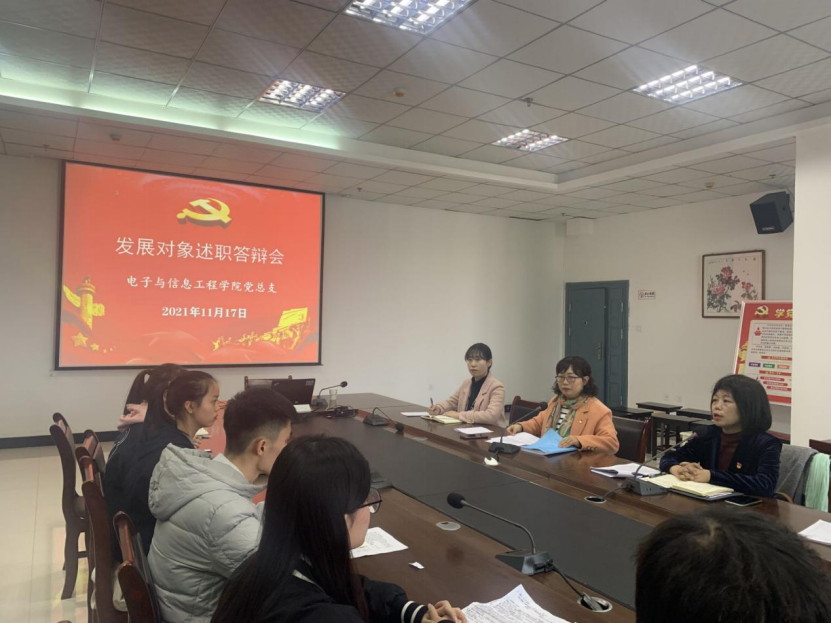 2021年11月17日下午,电子与信息工程学院党总支在逸夫科技楼九楼会议室召开发展对象述职答辩会。党总支书记于咏梅,副书记蔡正旺,组织委员成英丽,学生第一党支部书记程晓梅、支委张宇航,学生第二党支部书记李章雨、支委石纭昊以及学院全体第23期发展对象参加答辩会。会议由党总支组织委员成英丽主持。
