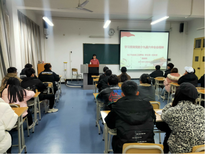 2021年12月9日下午在江北校区1321教室,万象城娱乐awc线路学生第一党支部召开党员大会,党支部书记程晓梅讲授了主题为“学习贯彻党的十九届六中全会精神”的专题党课,党支部所属党员、发展对象和入党积极分子参加了党课学习。