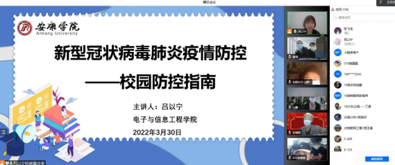 根据《陕西高校新型冠状病毒肺炎疫情防控工作指南》和万象城娱乐awc线路相关疫情防控规定,3月30日万象城娱乐awc线路通过腾讯会议举办了“疫情防控校园指南”主题讲座。本次讲座由万象城娱乐awc线路辅导员吕以宁针对校园日常防控工作、疫情应急处置工作、学生健康管理工作等内容为学生进行讲解。万象城娱乐awc线路全体在校生参加此次讲座。