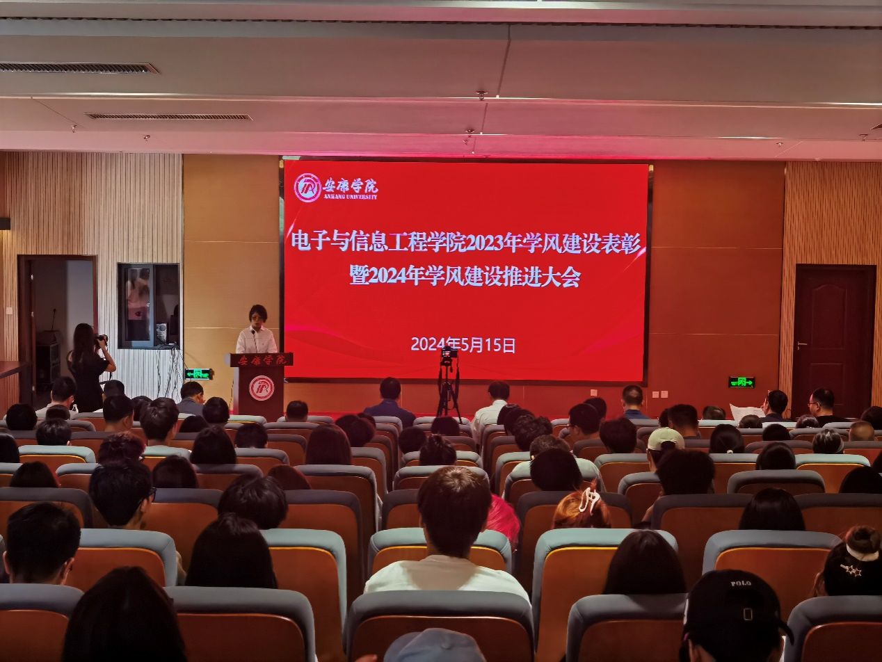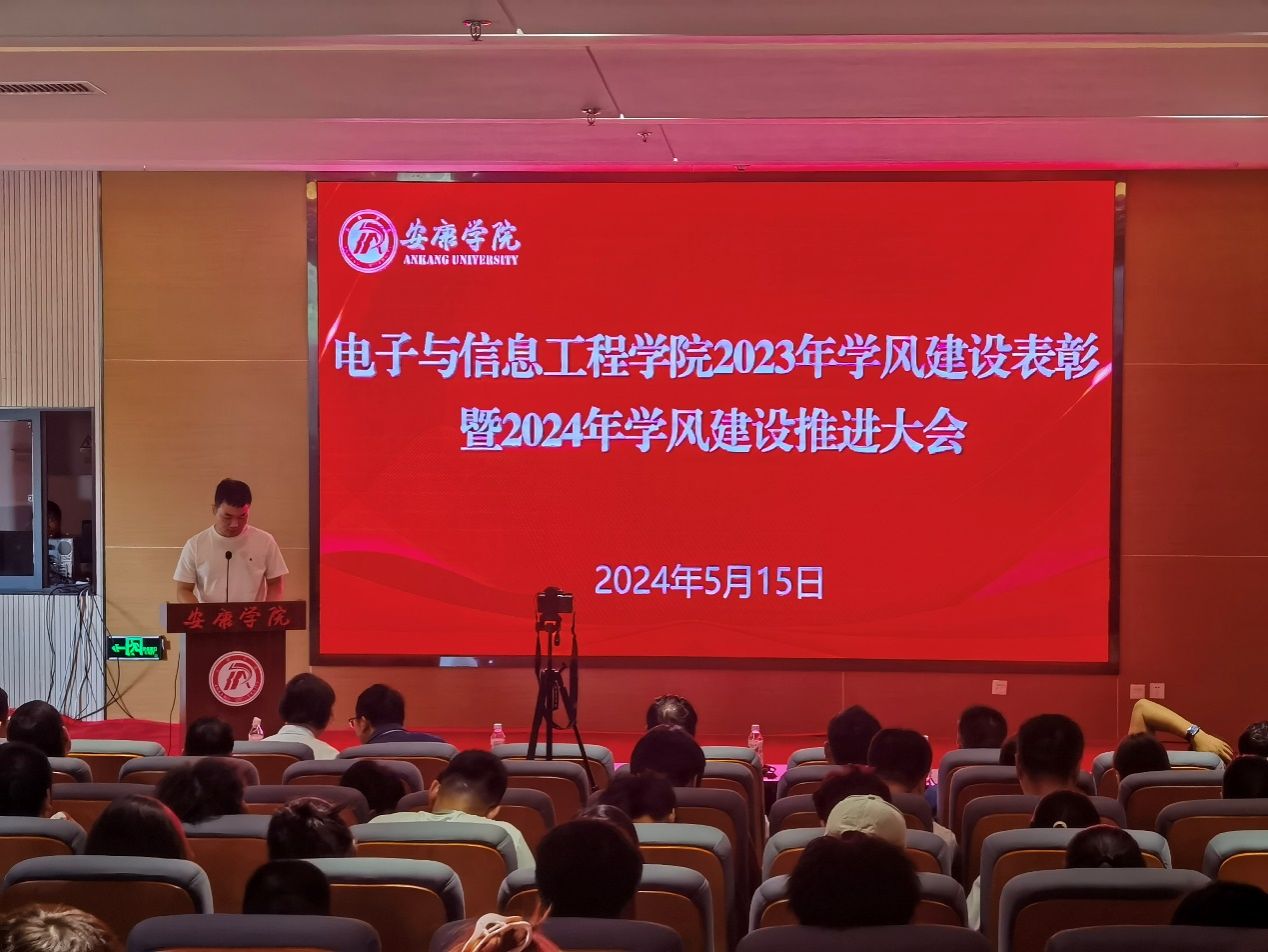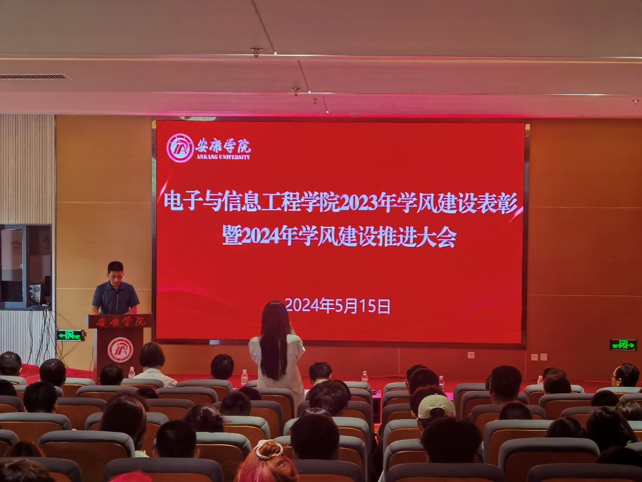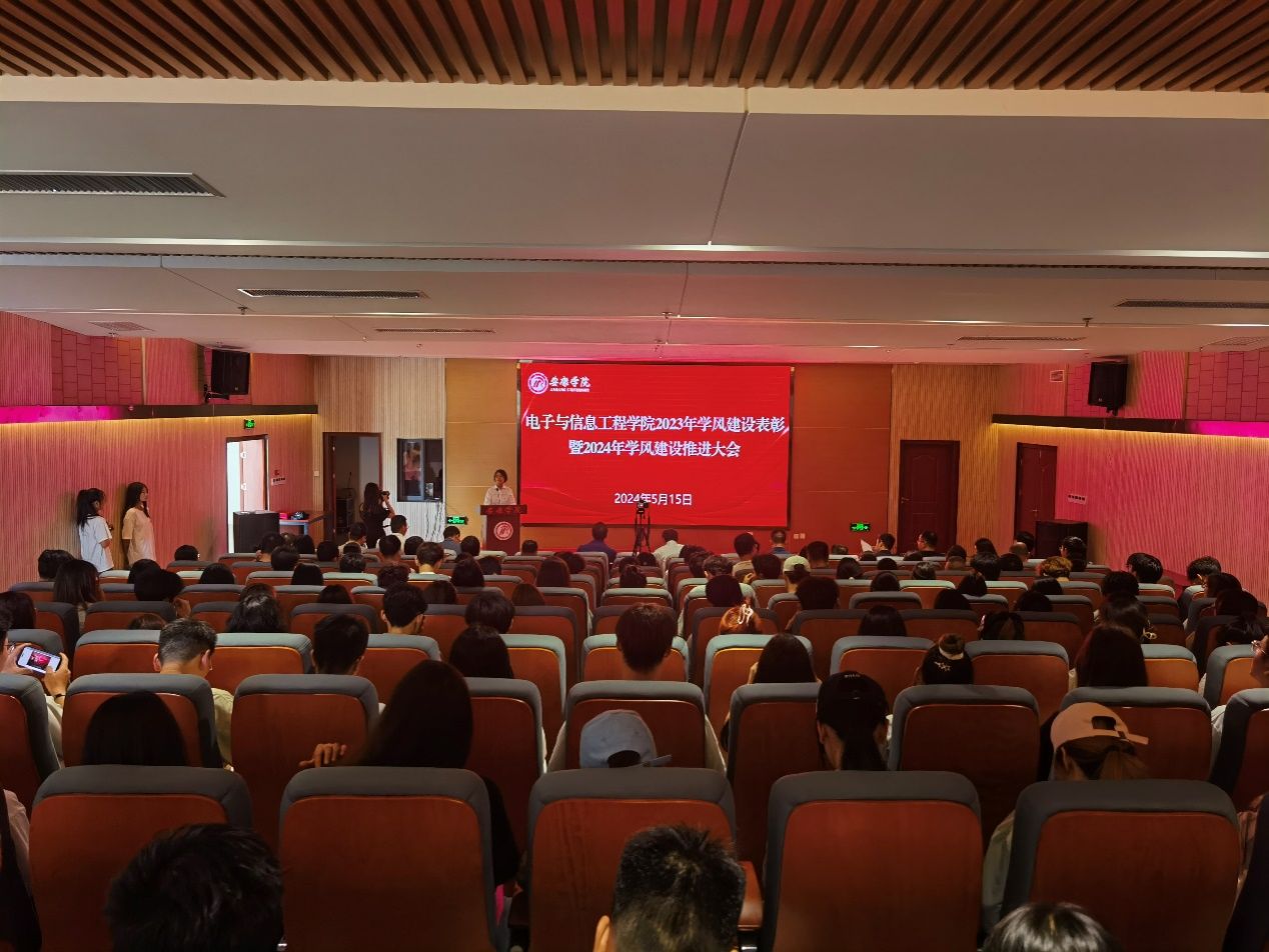 为培育优良学风,着力强化学风建设整体性、协同性、主体性,电子与信息工程学院以迎接本科教育教学审核评估为契机,以加强学生思想政治教育为纲,以学风建设为龙头,以教育学生树立远大理想、明确学习目的、端正学习态度为核心,以班级建设和宿舍管理为重点,以制度建设为保障,融入学院特色、打造学院“五色”育人品牌,着力构建学风建设的长效机制。5月15日下午,电子与信息工程学院在江北校区图书馆报告厅召开了2023年学风建设表彰暨2024年学风建设推进大会。会议由党总支书记于咏梅主持,万象城娱乐awc线路全体教师、团总支学生会主要干部、2021、2022、2023级班团主要干部,受表彰学生代表参与。