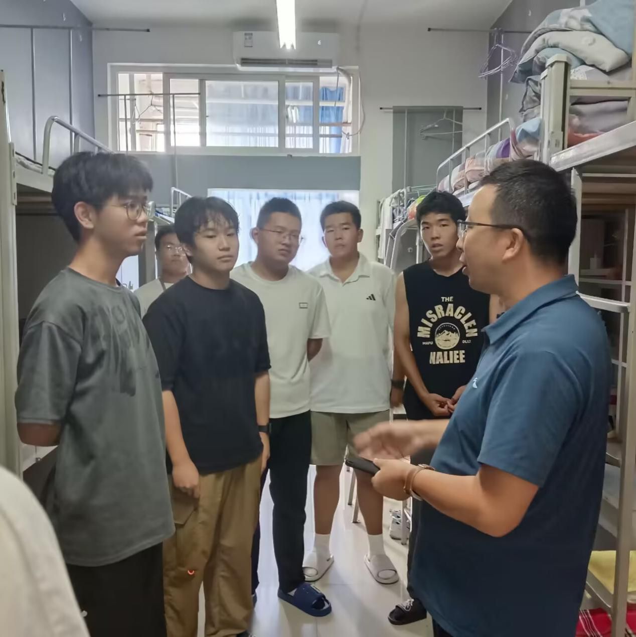 在走访过程中各位老师首先向新生们致以热烈的欢迎,并逐一询问了他们的姓名、家乡、兴趣爱好以及初来乍到的感受。新生们略显羞涩却又不失热情地回应着,分享着各自的故事与期待。有的新生表达了对未来专业学习的憧憬,有的则对即将展开的社团活动和校园文化生活充满了好奇。老师鼓励各位学生要珍惜大学时光,勇于探索,敢于挑战自我。