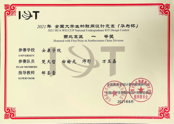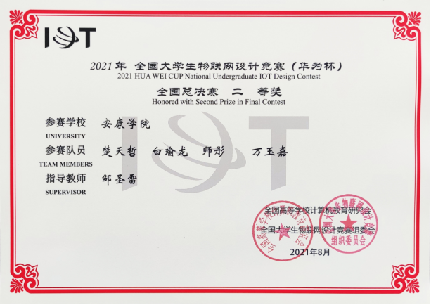 近日,2021年全国大学生物联网设计竞赛(华为杯)全国总决赛在上海紫竹科学园隆重举行。电子与信息工程学院邹圣雷老师指导的学生团队(楚天哲、白瑜龙、师彤、万玉嘉)表现出色,在西北赛区获一等奖入围全国总决赛,最终荣获全国二等奖。