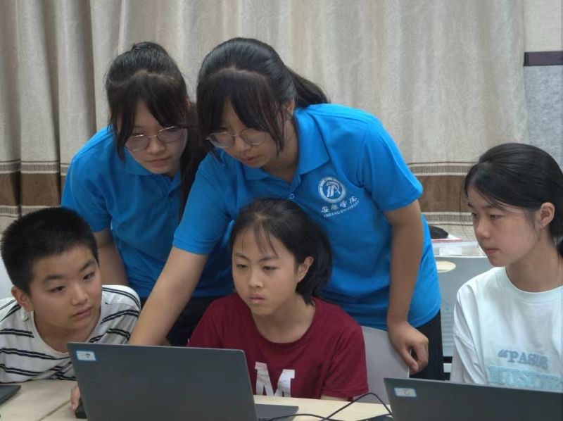 结合当地需求,本期实践团队共招募9名志愿者,组成两队分别在白河县茅坪镇中心小学、宋家镇中心小学开展少儿编程支教活动。从基础的计算机操作到简单的编程逻辑,志愿者一步步引导孩子们探索编程的奥秘。以编程软件为例,志愿者不仅讲解了编程基本语法、变量声明、数据类型等基础知识,还通过实际编程练习,让孩子们亲手参与编写代码,体验从构思到实现的全过程。孩子们对这样的创意课堂充满兴趣,提出了不少奇思妙想,志愿者们也逐一耐心解答了他们的困惑,课堂氛围非常热烈。