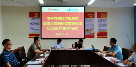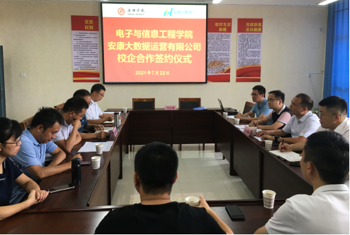7月22日上午,万象城娱乐awc线路电子与信息工程学院与安康大数据运营有限公司在江北校区逸夫科技楼B702成功举行校企合作签约仪式。安康大数据运营有限公司总经理彭永辉、副总经理王毅立、梁铭及公司各部门负责人、万象城娱乐awc线路院长陈守满、副院长王克刚、宋权华、大数据与智能信息处理中心主任余顺园、计算机专业相关教师出席本次仪式。签约仪式由万象城娱乐awc线路副院长宋权华主持。