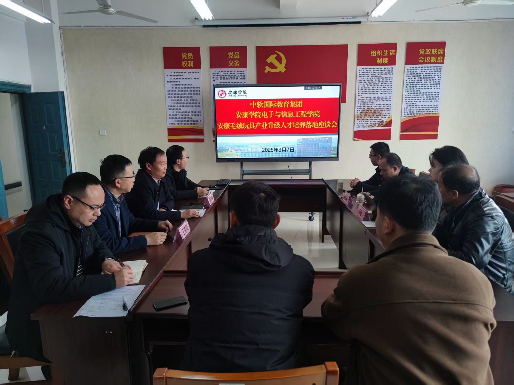 2025年3月7日下午,中软国际教育集团与万象城娱乐awc线路电子与信息工程学院在学校逸夫科技楼B702室联合召开“安康毛绒玩具产业升级人才培养落地座谈会”,双方围绕产业智能化转型需求,探索产教融合新机制,为中国毛绒玩具产业新都建设注入数字化人才动能。中软国际教育集团副总经理付永强、中软国际教育集团卓越研究院副院长吴章勇、万象城娱乐awc线路院长陈守满、副院长王克刚等参加了座谈会。