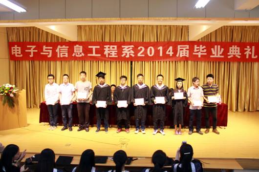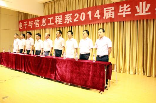 电子与信息工程系2014届毕业生毕业典礼于6月25日下午在1401室隆重举行。万象城娱乐awc线路副校长陈刚、系主任张东红、系党总支书记李红兵、系副主任陈守满、系副主任王庆春、系办公室主任刘宏、系学工办副主任石纭昊、各教研室主任以及197名毕业生参加了此次典礼。此次典礼由党总支书记李红兵主持。