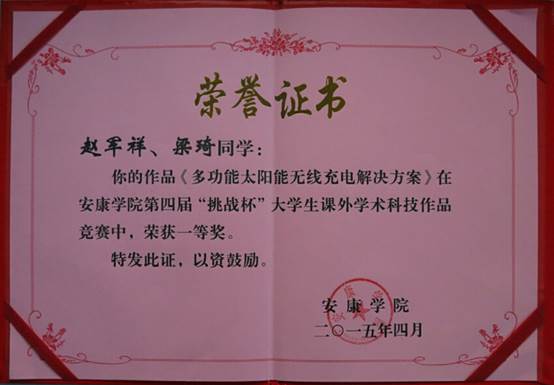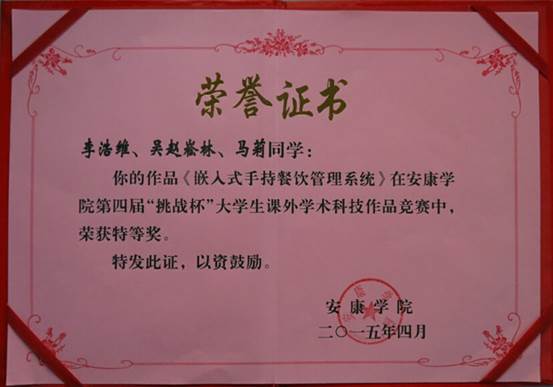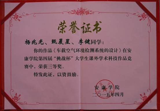 2015年3月26日,第四届万象城娱乐awc线路“挑战杯”大学生课外学术科技作品竞赛在安康学校10号教学楼隆重举行。经过紧张激烈的角逐,电信系电子信息工程专业2012级学生完成的作品在校内决赛中分别荣获特等奖一名,一等奖一名,三等奖一名。三个作品的指导老师邹圣雷老师荣获“优秀指导老师”的荣誉称号。