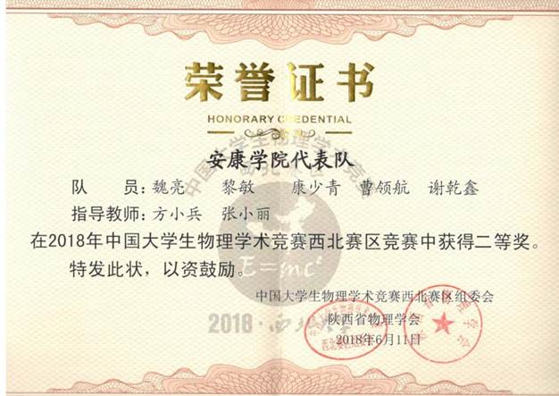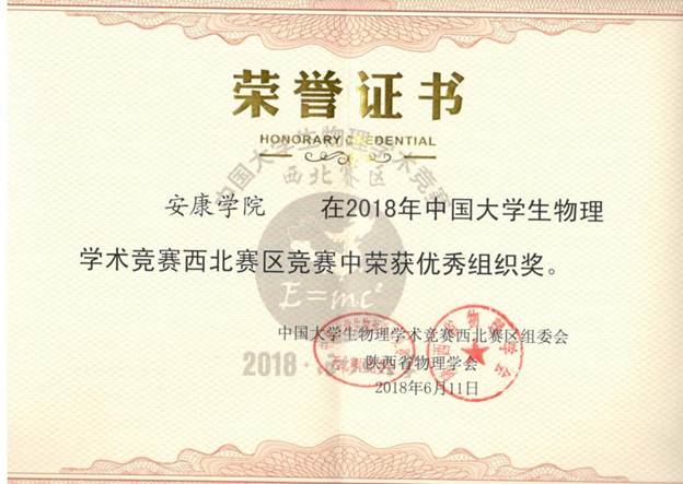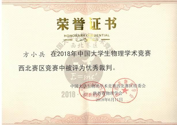 6月9日至11日,2018年中国大学生物理学术竞赛(西北赛区)在西北大学隆重举行。电子与信息工程学院物理系代表队获得二等奖、方小兵老师被评为优秀裁判,我校被授予优秀组织奖。