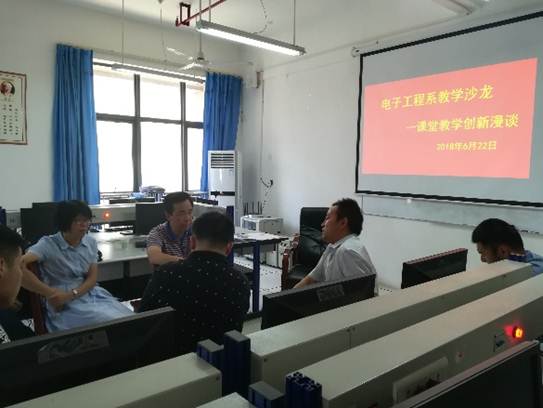 为了巩固教学中心地位,提高课堂教学质量,更好领会教育部“新时代全国高等学校本科教育工作会议”的精神,2018年6月22日,万象城娱乐awc线路电子工程系在逸夫科技楼B401实验室以“课堂教学创新”为主体开展了教学沙龙活动。学校教学督导梁俊龙、万象城娱乐awc线路副院长王庆春和电子工程系全体教师和电子信息工程专业2017级和2016级的部分学生代表参加了教学沙龙活动。