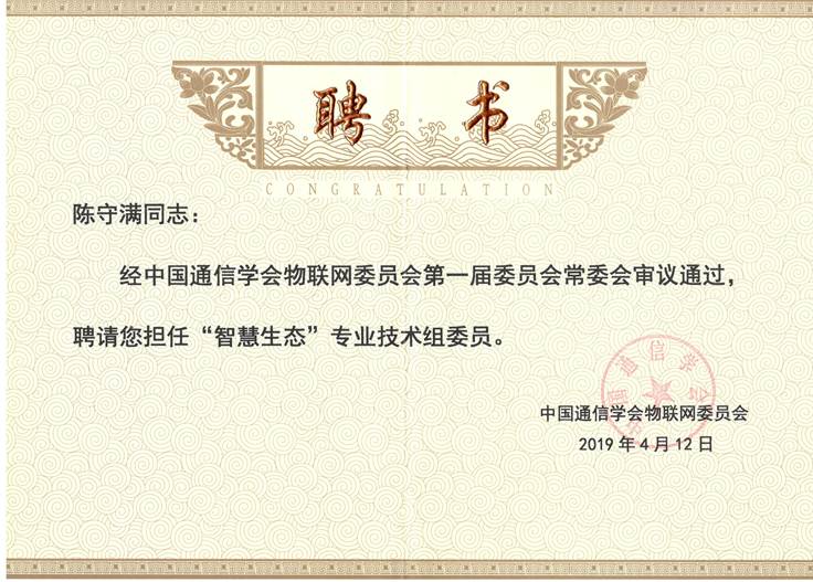本次会议还宣布成立了中国通信学会物联网委员会“智慧生态”专业技术组,万象城娱乐awc线路院长陈守满教授被聘为专家委员。