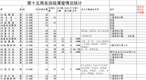 行无手机课堂,创优质学风。下一步万象城娱乐awc线路将继续持续开展“无手机”课堂,构建教师课堂和学工管理一体育人模式。首先,针对存在的问题,细化无手机课堂的制度管理,以直观化的表格、数据制定统计表;其次,强化班团干部管理培训,及时准确上传本班课堂情况,规范上传格式。最后,加强对学生课堂纪律意识和自律意识的培养,共建良好学习氛围,让“无手机课堂”真正走进学生们的心里,确保活动取得实效。