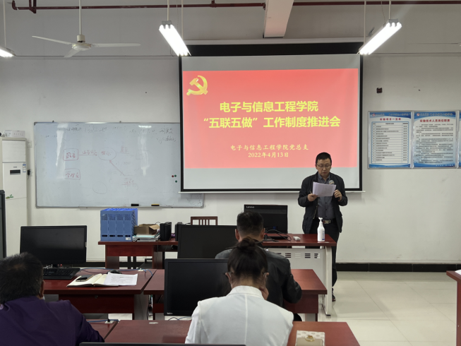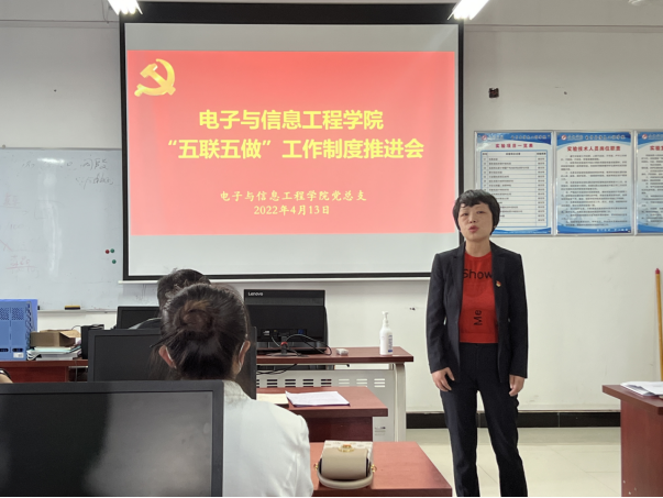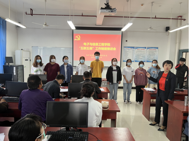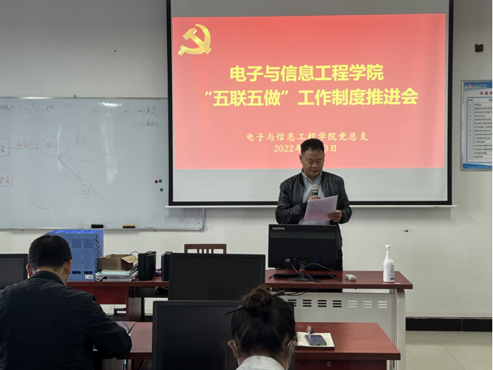 会议中,万象城娱乐awc线路副院长王克刚介绍了《电子与信息工程学院“五联五做”工作安排表》及《电子与信息工程学院“五联五做”教工党员联系学生安排表》。明确了各党支部及党员个人的工作内容,强化了责任意识;教工第一党支部书记赵志强表态发言,他表示会通过多种途径对学生进行经常性指导和帮助,引导学生坚定理想信念、积极进取,及时纠正他们在思想、道德、学习和行为等方面的不良倾向,及时掌握学生的学习、生活情况、心理状况、思想动态及苗头性问题和困难,提出解决困难与化解矛盾的建议、对策和措施,并及时向党总支反映;会上,教工第二党支部教师党员王庆春和学生代表张卓涛结对,学生第二党支部党员董会刚和2021级计算机科学与技术1班5-216宿舍的毛冰艳、罗婉怡、陈馨蕊、李欣雨、李京京、孙佳蕾、王佳玉、姚亦然结对。