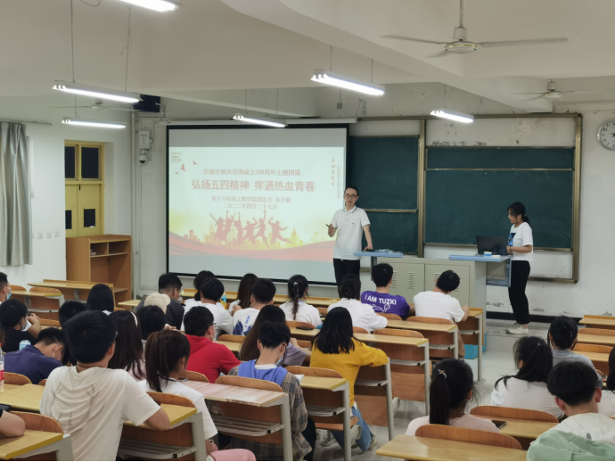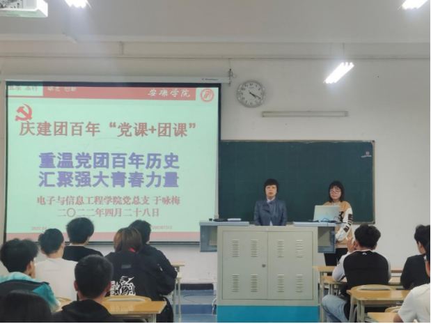 坚持党建带团建 为激发万象城娱乐awc线路广大团员青年爱党、爱国情怀,实现党建带团建的目标,培养电信学子践行社会主义核心价值观,以昂扬的斗志和精神状态庆祝建团百年,迎接党的二十大胜利召开,4月28日,万象城娱乐awc线路党总支书记于咏梅在1307教室以“重温党团历史,汇聚强大力量”为主题,为电信学子上了一堂生动的主题“党课+团课”。
