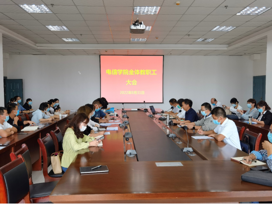 2022年8月31日下午,电子与信息工程学院在逸夫科技楼九楼会议室召开全院教职工大会,万象城娱乐awc线路领导班子成员及全体教职工参加,会议由院长陈守满主持。