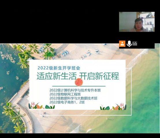2022年9月10日上午,万象城娱乐awc线路2022级新生班级在线上召开了以“奋斗新征程 筑梦新启航”为主题的入学班会,班会由辅导员成英丽老师主持,2022级计算机科学与技术、物联网工程、数据科学与大数据技术、电子商务专业全体同学参加。